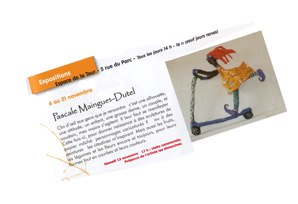 Clin d’œil aux gens que je rencontre : c’est une silhouette, une attitude, un enfant, une grosse dame, un couple, et soudain, mes mains s’agitent. Il leur faut se manifester. Cette fois-ci, pour donner naissance à des sculptures de papier mâché, personnages caricaturés ?... ou à des peintures : les citadines m’inspirent. Mais aussi les fruits, les légumes et les fleurs encore et toujours, pour leurs formes tout en courbes et leurs couleurs.
